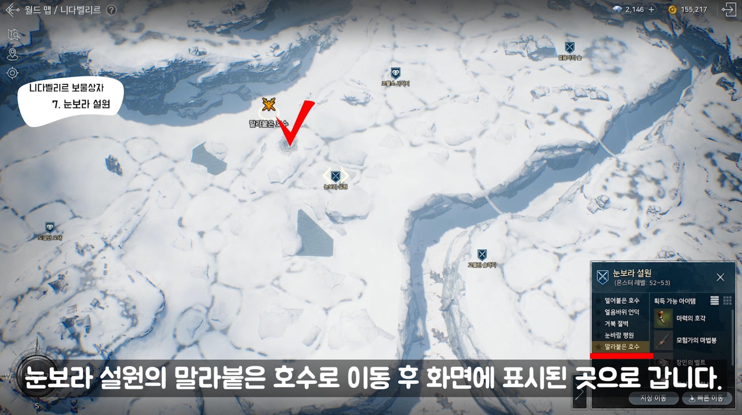 눈보라 설원의 말라붙은 호수로 이동 후 화면에 표시된 곳으로 갑니다.